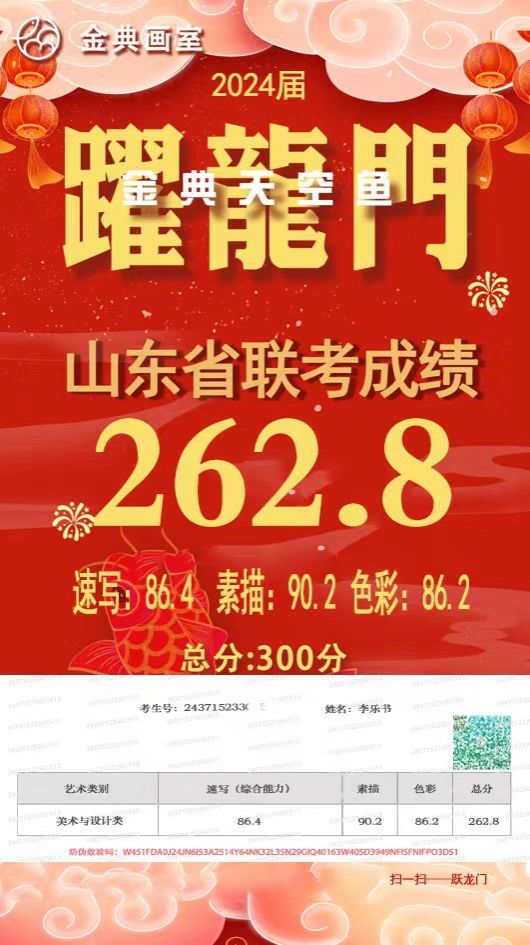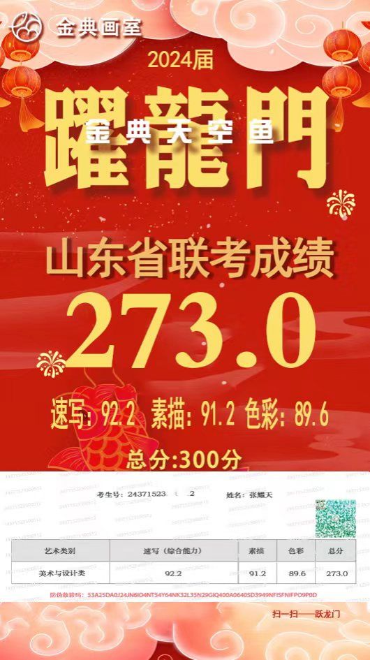 2023年参加山东省美术统考人数为63697人,省平均过关率为74.35%,金典画室为98.33%;省高分率为20%,金典画室高分率为46.33%;省超越高分率为5%,金典画室为25%。2023年全校平均分为245.626分